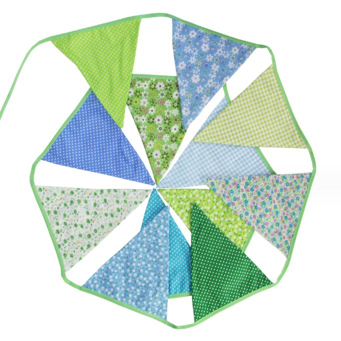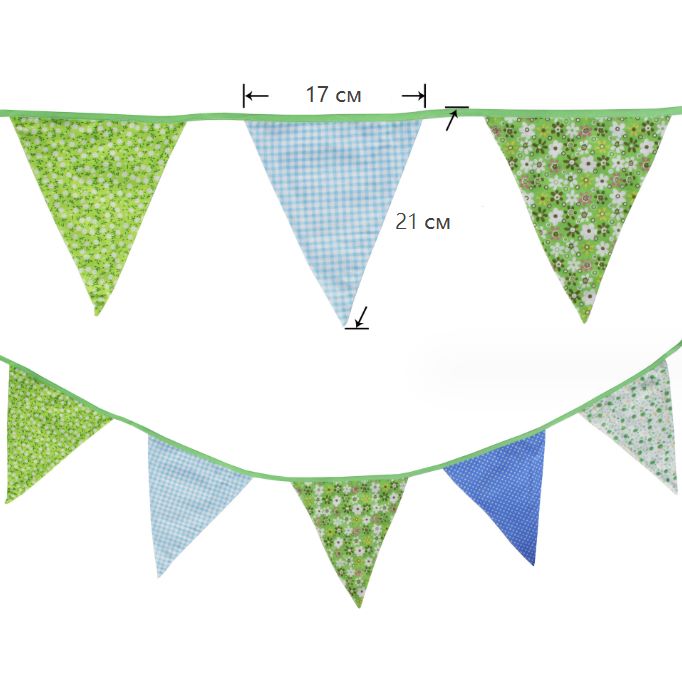 Гирлянда состоит из 12 флажков, расстояние между флажками 6 см, общая длина составляет 4 м.
