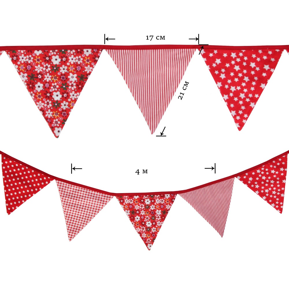 Гирлянда состоит из 12 флажков. Расстояние между флажками - 6 см, общая длина составляет 4 м.
