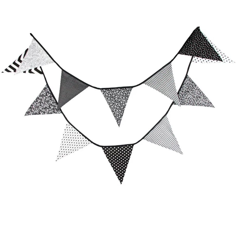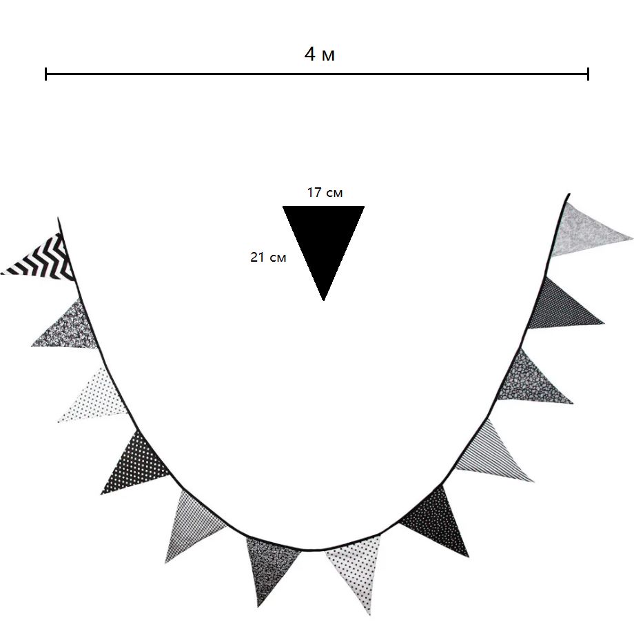 Гирлянда состоит из 12 флажков, расстояние между флажками 6 см, общая длина составляет 4 м.
