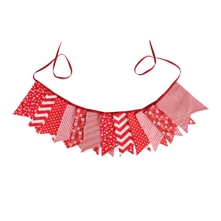 Гирлянда состоит из 12 флажков, общая длина составляет 3,4 м, расстояние между флажками 3 см, длина матерчатых флажков 2,1 м, длина лямок с обеих сторон по 50 см