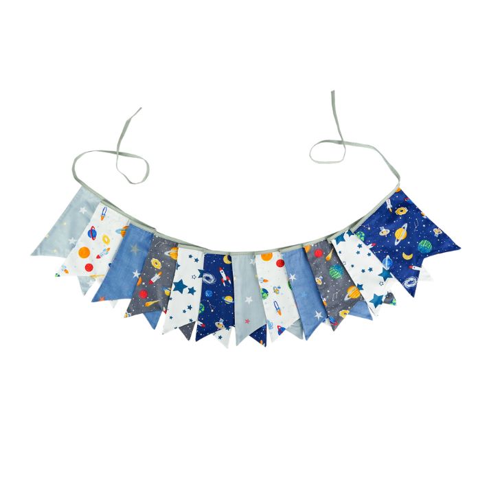 Гирлянда состоит из 12 флажков, общая длина составляет 3,4 м, расстояние между флажками 3 см, длина матерчатых флажков 2,1 м, длина лямок с обеих сторон по 50 см