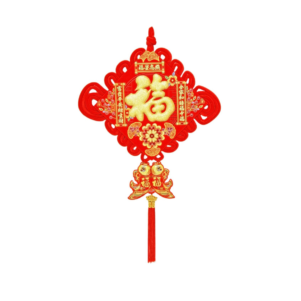 Традиционный китайский узел в форме ромба с символичным дизайном. Яркое сочетание красного бархата и золотых элементов создает эффектный акцент в интерьере.