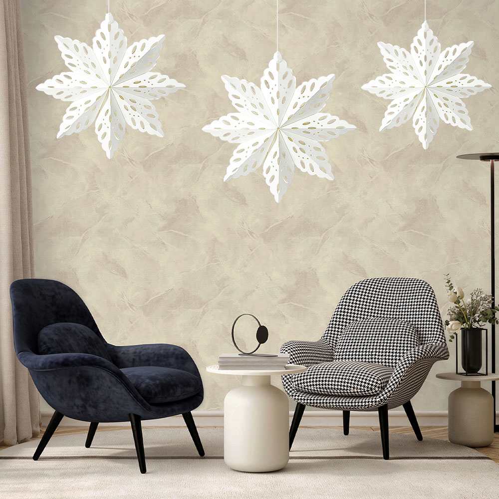Элегантная объёмная снежинка из плотной бумаги белого цвета — изысканное украшение для зимнего интерьера, витрин, залов и новогодних фотозон. Ажурный рисунок придаёт ей лёгкость и воздушность, создавая ощущение снежной свежести и уюта.